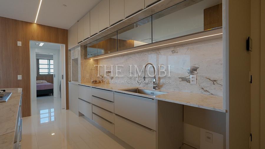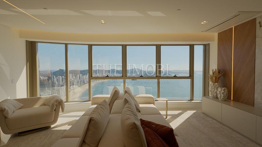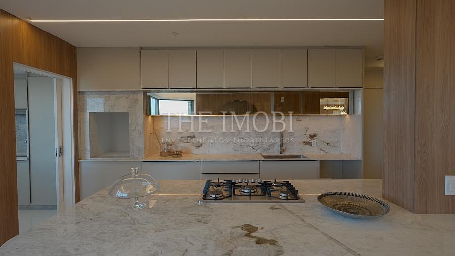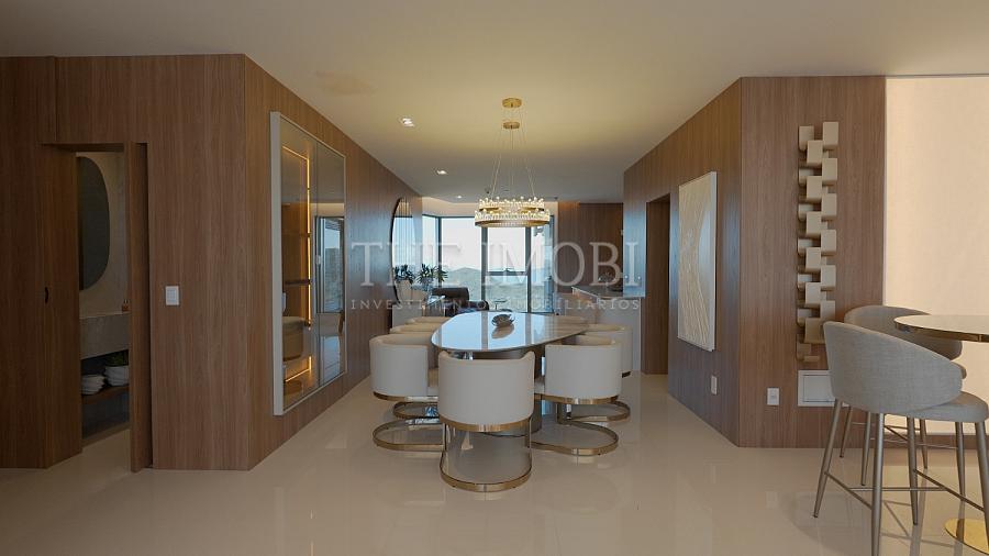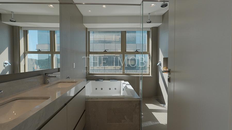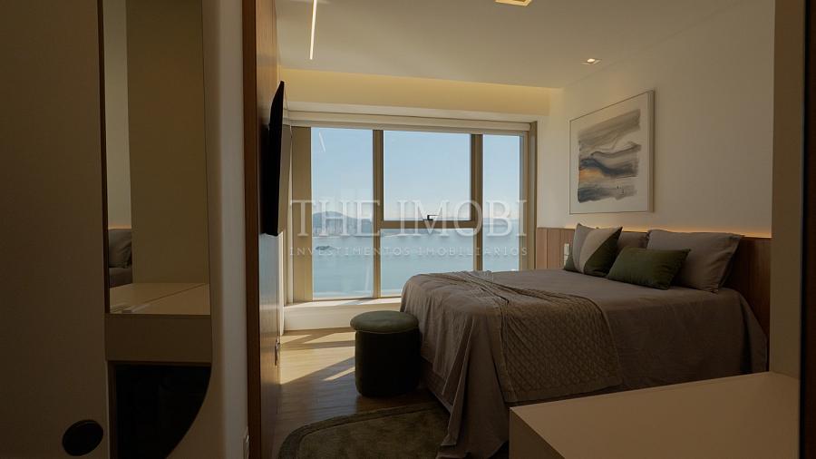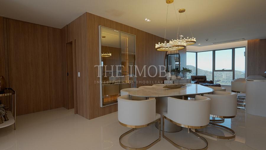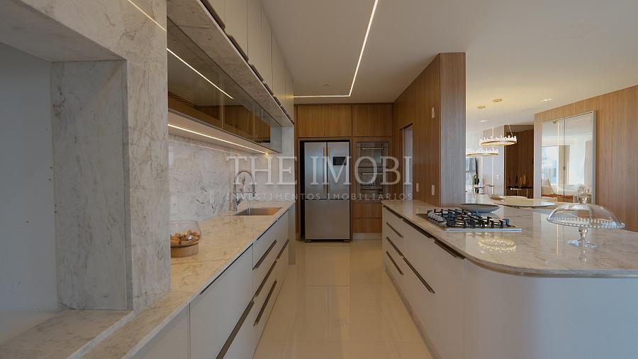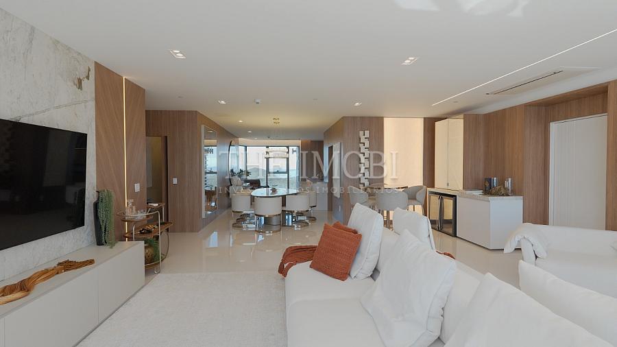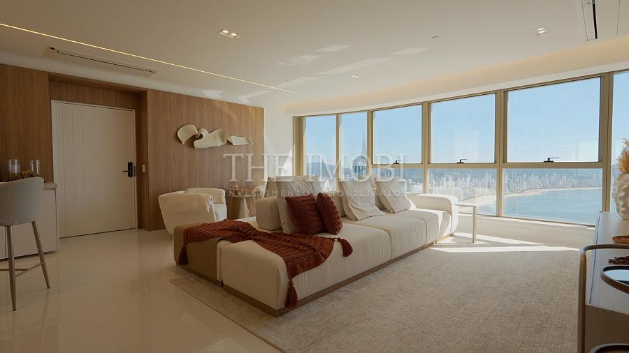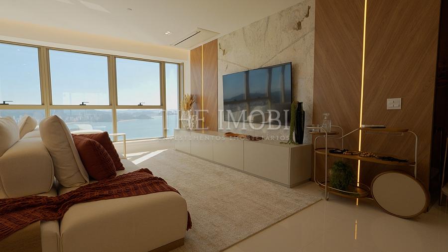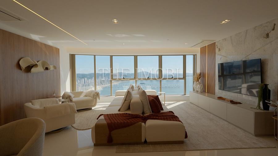 O imóvel apresenta ambientes generosos, integrados e elegantemente decorados, com acabamentos de altíssimo padrão que incluem mármore, madeira nobre e esquadrias em aço escovado. O projeto prioriza a entrada de luz natural através de grandes janelas e varandas espaçosas que proporcionam uma experiência visual incomparável da cidade e do mar.