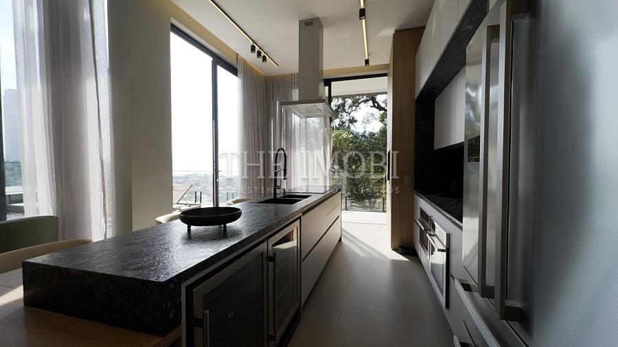 • Cozinha gourmet com churrasqueira a carvão integrada à varanda e aos ambientes sociais