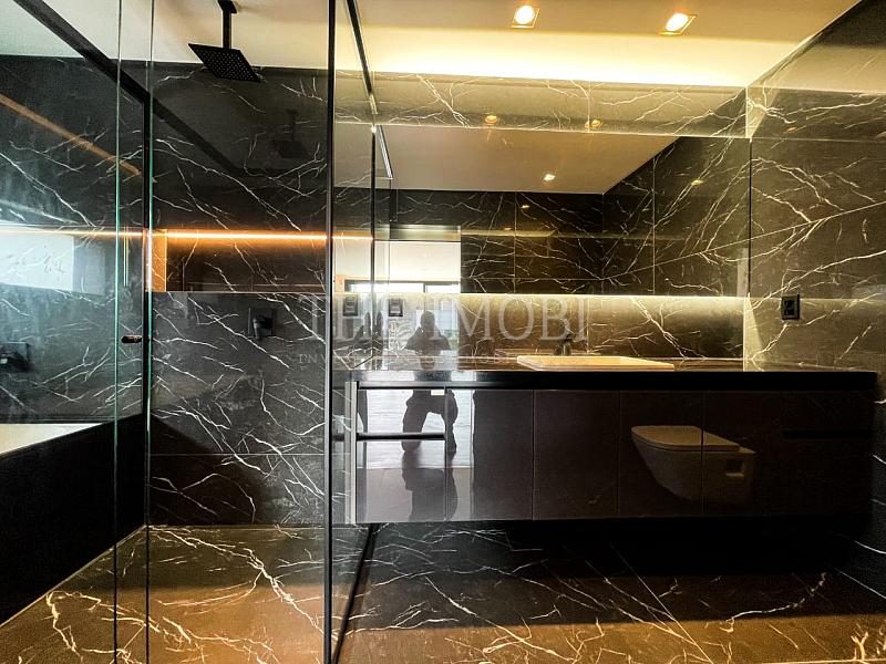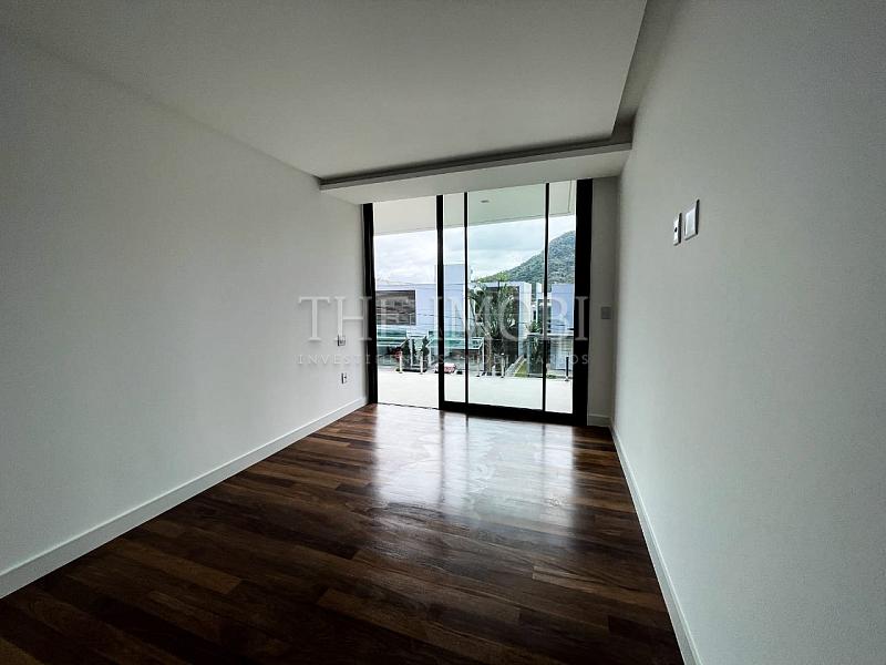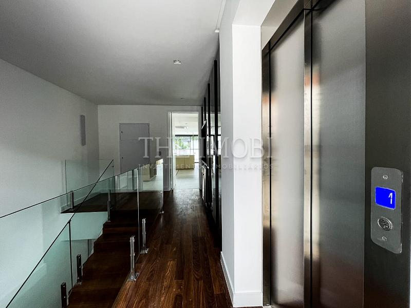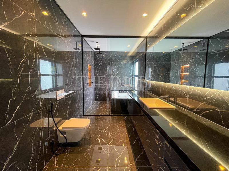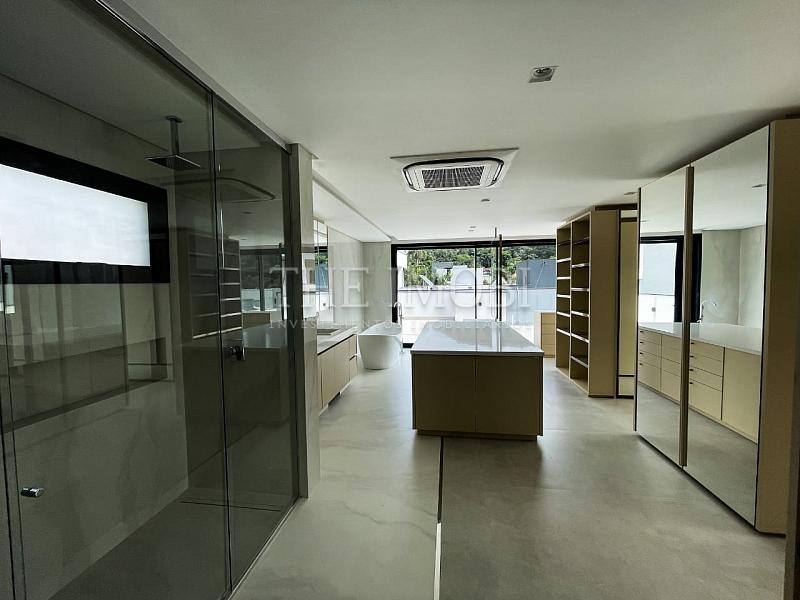 Suíte master exclusiva no terceiro piso com 210 m², incluindo closet de 150 m², banheira de imersão, fogo de chão e copa privativa.